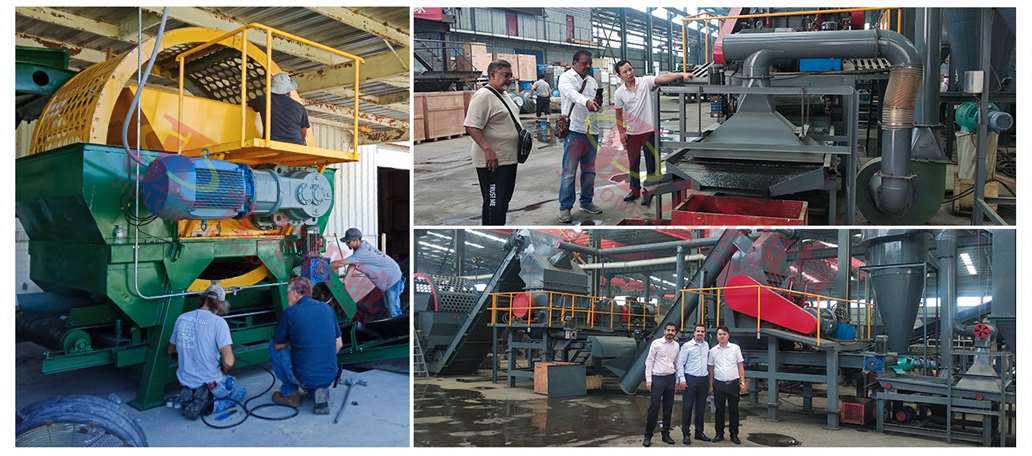 在工作原理上輪胎撕碎機采用低速高扭矩轉(zhuǎn)動的主軸電機直連設計通過刀片卡角作用將整個廢舊輪胎進行破碎加工,經(jīng)過雙軸撕裂加工后的廢舊輪胎塊在滾篩的作用下實現(xiàn)在整個破碎過程中小于或者等于50*50的物料從圓網(wǎng)篩中漏出,進入后續(xù)工序;大于50*50的物料經(jīng)圓網(wǎng)篩返回到破碎室進行循環(huán)破碎,直至膠塊大小符合要求后排出撕碎機。經(jīng)過排出的大塊輪胎顆粒。